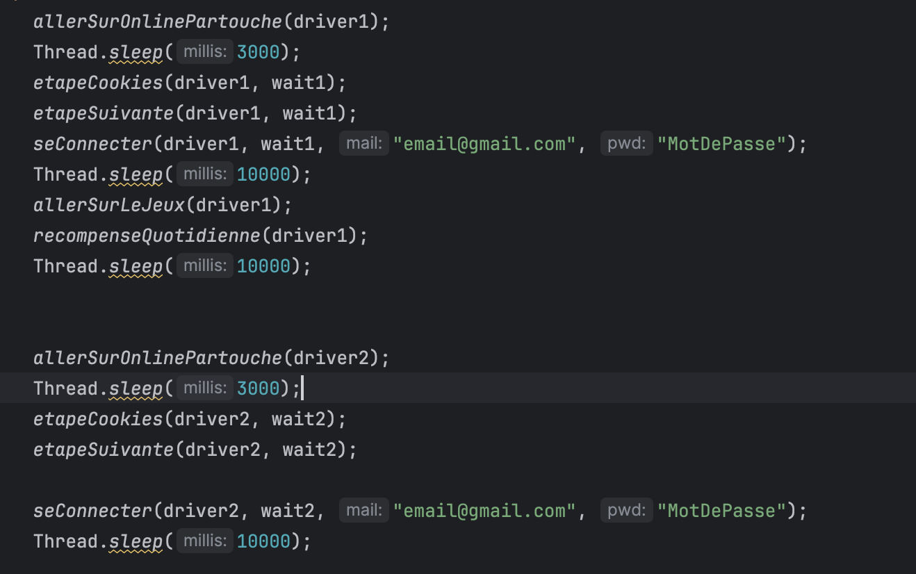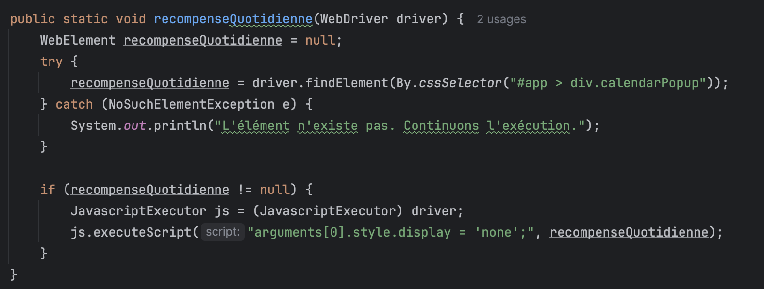 Pour ce projet, je voulais récupérer des points sur un site, mais le seul moyen était de jouer à un jeu. Comme je manquais de temps, j’ai décidé de coder un outil qui le ferait automatiquement à ma place. Cet outil, développé en Java avec Selenium, se connecte au site, joue au jeu, adapte les mises en fonction des points disponibles sur mon compte, et effectue toutes les actions de manière autonome.
