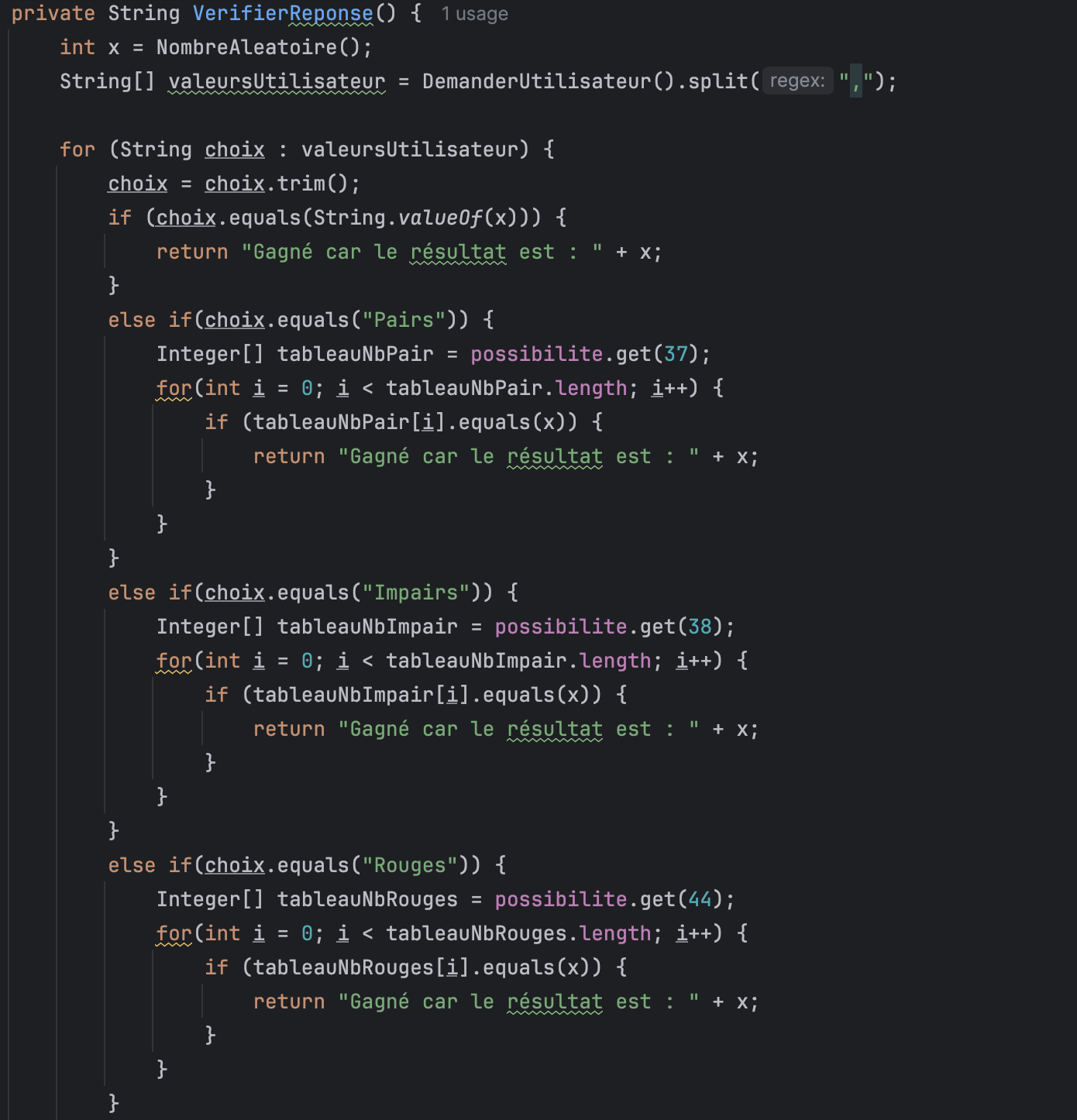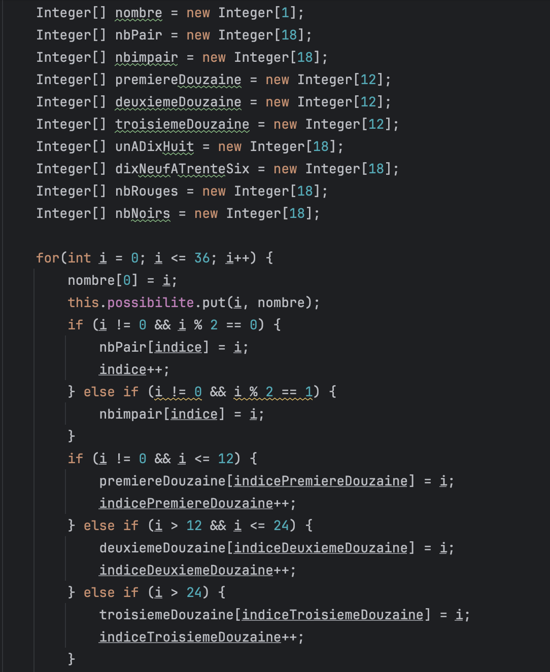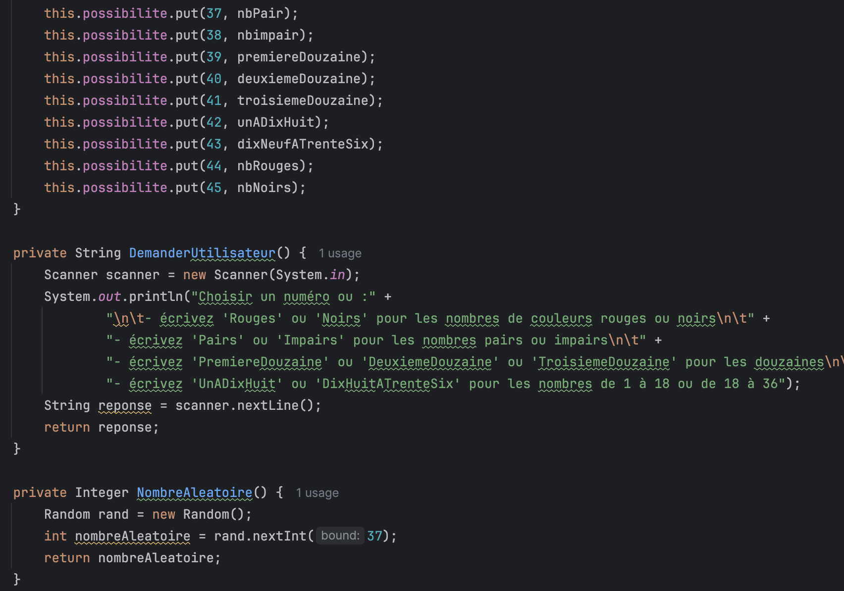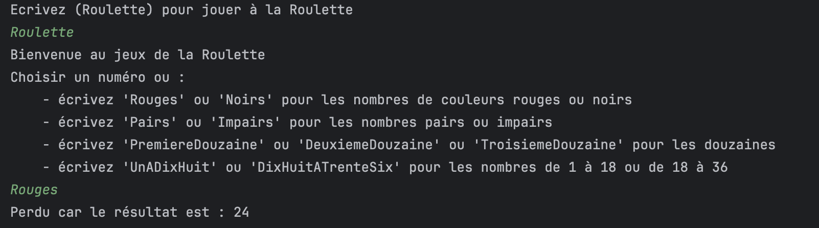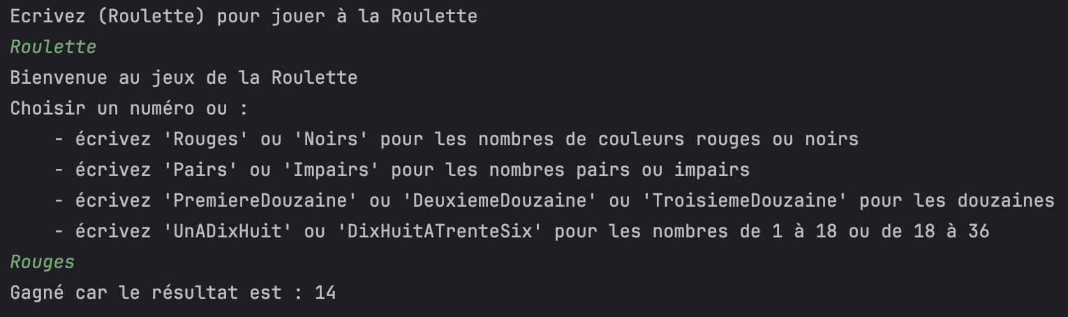 Pour ce projet, je voulais m'entraîner en Java et j'ai décidé de recréer le jeu de la roulette de casino. J'ai programmé les principales fonctionnalités comme les paris sur Rouge ou Noir, sur les Douzaines, ou encore sur les Pairs et Impairs. Le jeu de la roulette est simple : une bille tourne dans un cylindre composé de numéros de 0 à 36, et le numéro gagnant est celui sur lequel la bille s'arrête. Ce jeu a été codé en Java.
